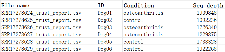 File content: Metadata table must contain at least the following columns: file name (File_name), sample ID (ID). It can also include grouping information (Condition) and sample sequencing depth (Seq_depth).